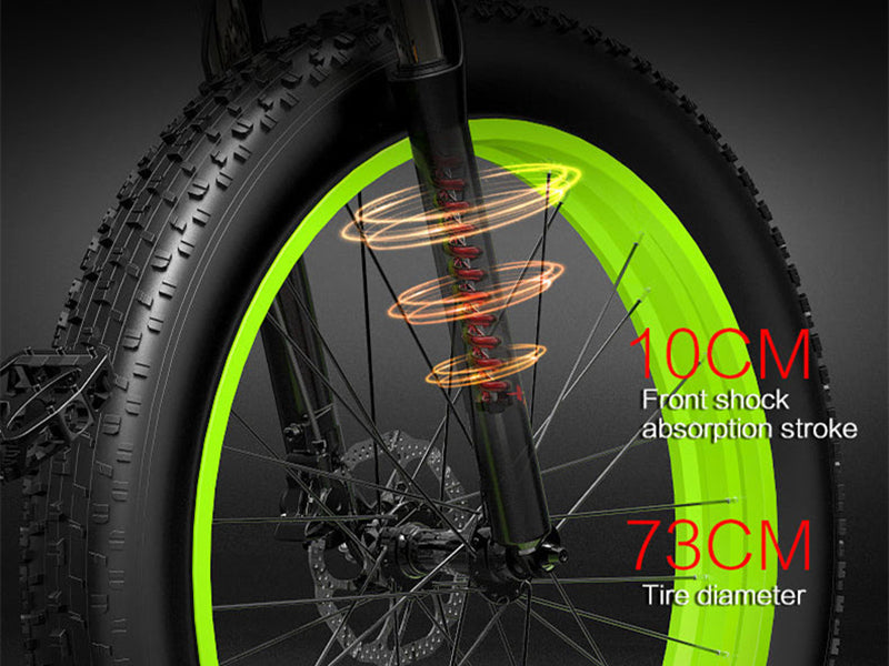 26*4.0 Fat Tires, use 26*4.0 all-terrain fat tires, the tire width reaches 10CM, anti-skid and anti-vibration, the span is larger and the comfort is higher.