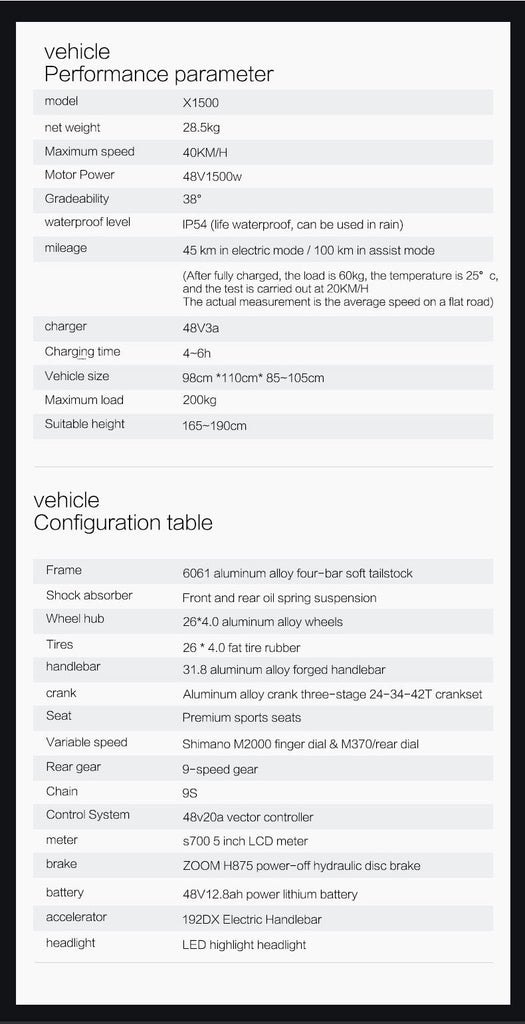 BEZIOR X1500 is forged by lightweight aluminum alloy frame, front and rear double oil spring suspension structure. in addition, newly upgraded 48v12.8ah power lithium battery, excellent 48v1500w high-speed brushless motor. Unique X1500 using power-off oil disc, 26*4.0 wheel diameter, suitable for Snow roads, asphalt roads, gravel roads and potholes. To accompany you to explore more riding fun.