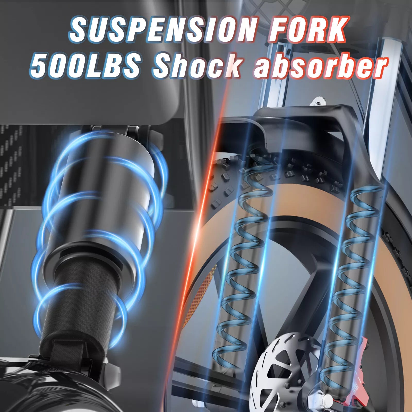 【Shamano 7-Speed & F/R Shock Absorber】Our electric dirt bike for adults features a high-strength front suspension and rear suspension fork that effectively absorbs shocks and provides better control while riding. The Shamano 7-gear shifting allows for reliable precision and comfortable ride control.